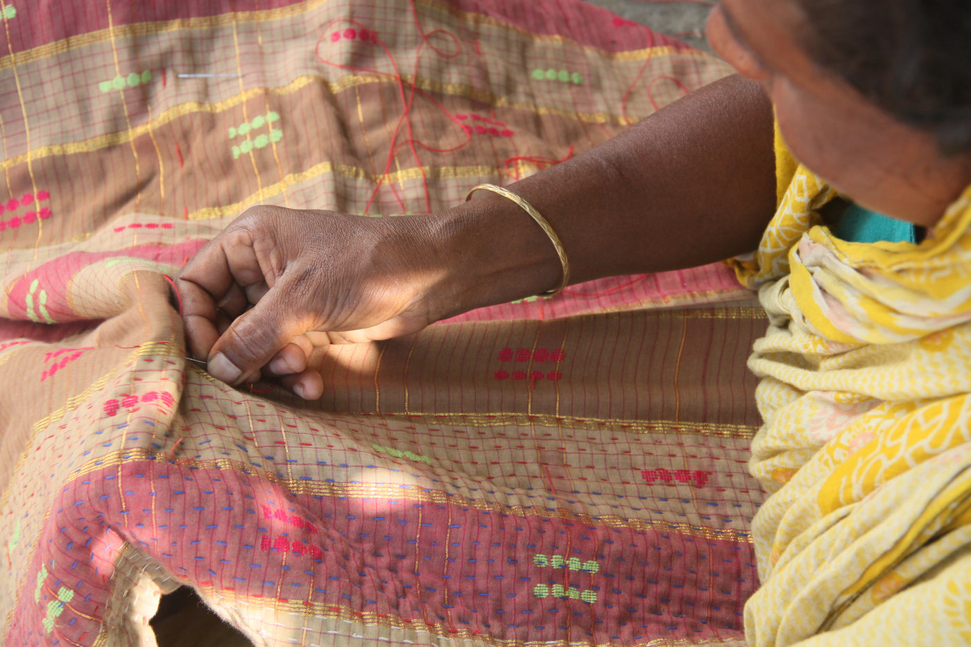 Layered textiles crafted from repurposed saris.