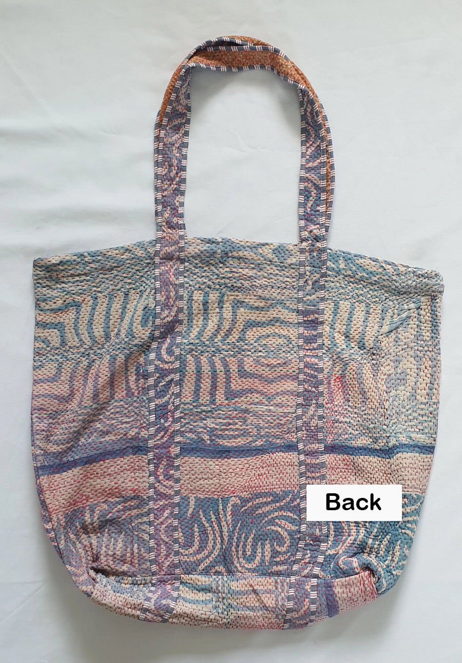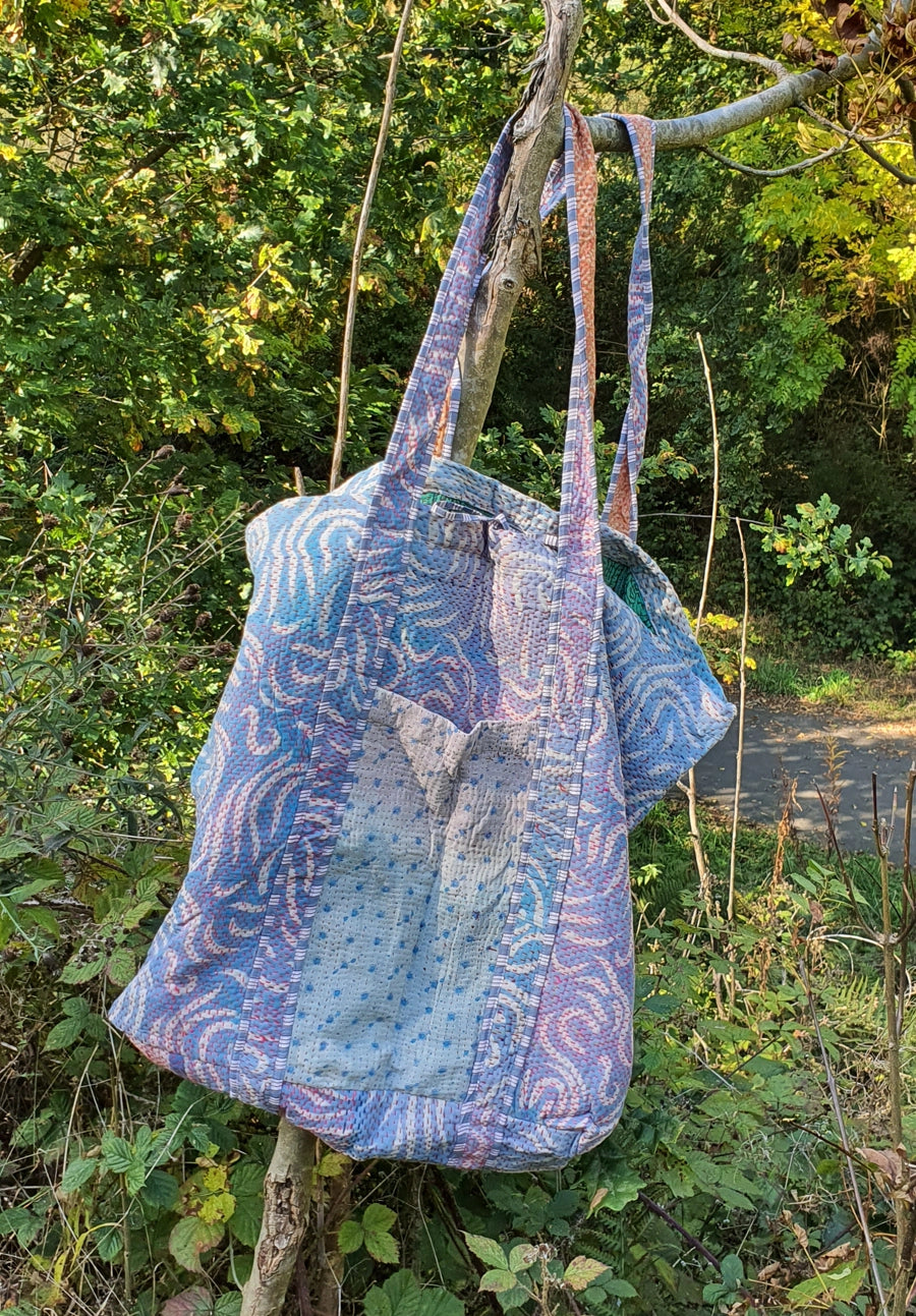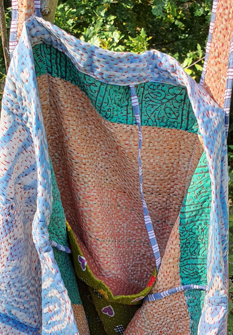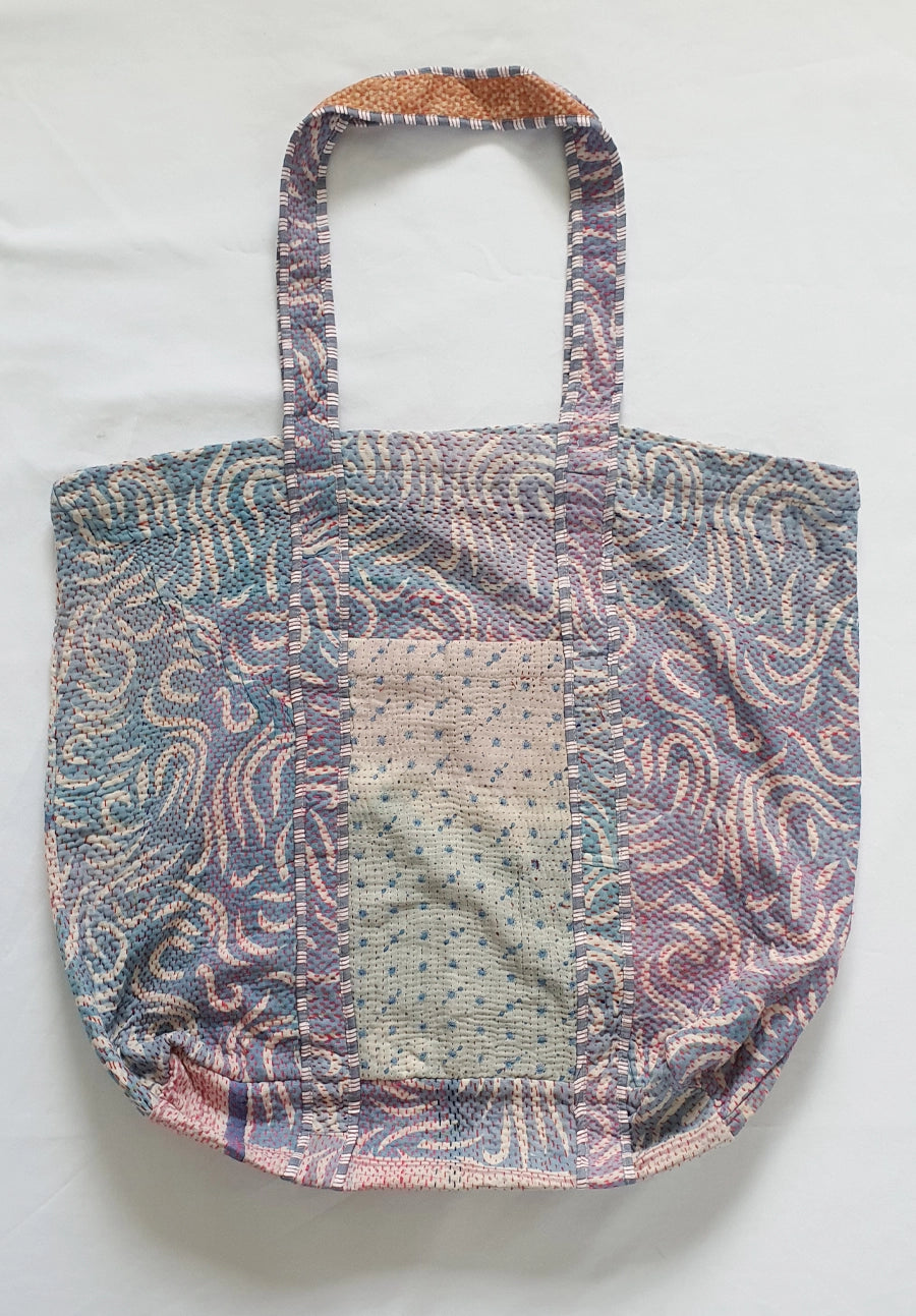 Crafted from vintage kantha quilts and off-cut block print fabrics from our eye masks, this large tote bag is a celebration of reinvention, resourcefulness, and everyday beauty. Each piece is unique, made using kantha quilts at the end of their life cycle, now thoughtfully refashioned into something new, purposeful, and full of charm.