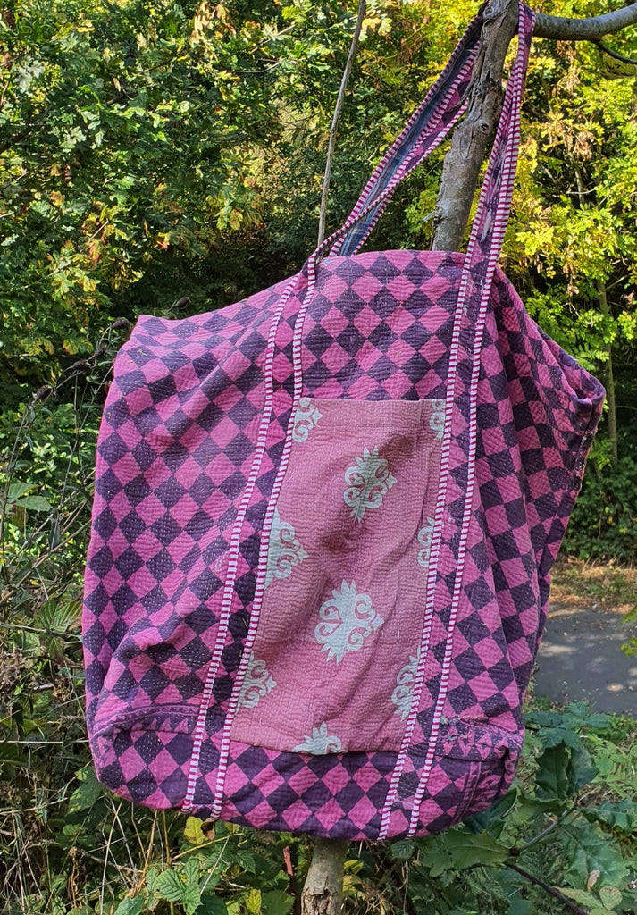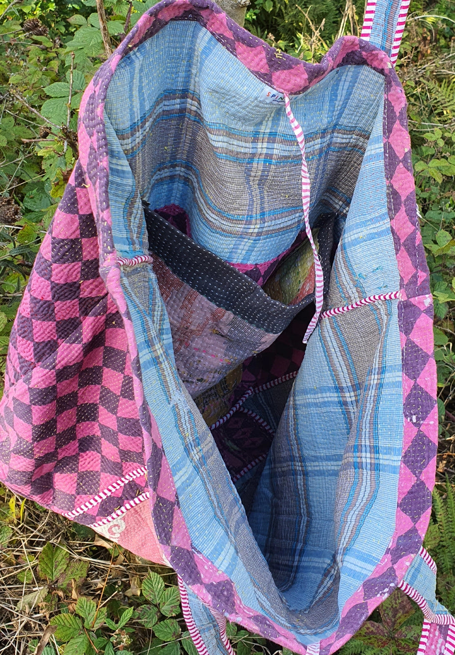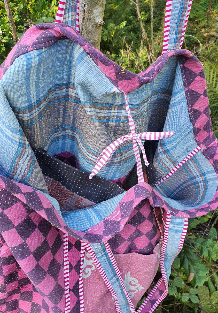 Crafted from vintage kantha quilts and off-cut block print fabrics from our eye masks, this large tote bag is a celebration of reinvention, resourcefulness, and everyday beauty. Each piece is unique, made using kantha quilts at the end of their life cycle, now thoughtfully refashioned into something new, purposeful, and full of charm.