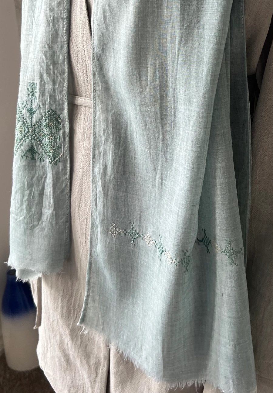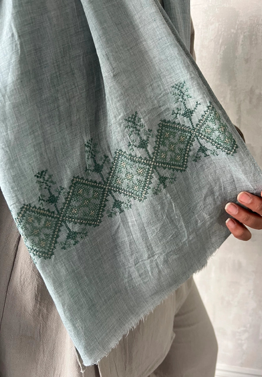 Green Linen Gauze Tatreez Embroidered Scarf, Hebron - Palestine