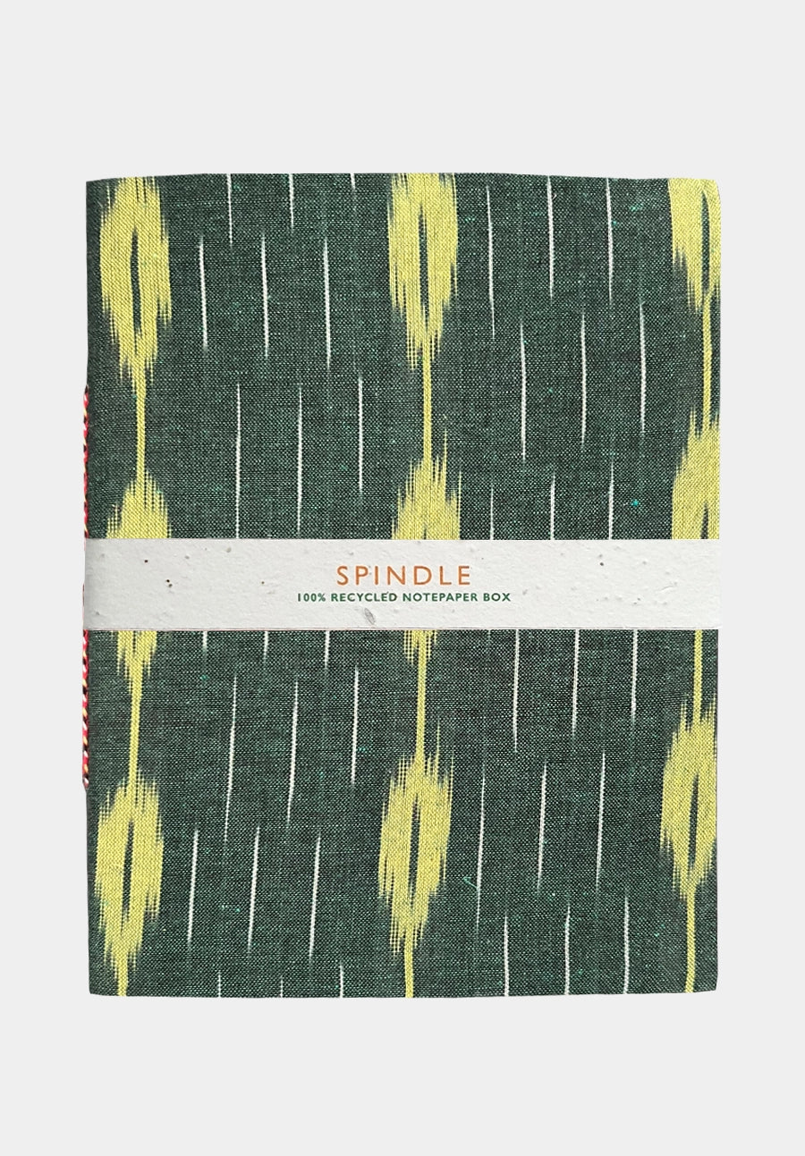 The fabric used to wrap this notebook is an off-cut from Ikat fabric. Ikat is a beautiful textile made up of complex patterns that are formed by employing resist dyeing on the yarns prior to dyeing and weaving the fabric.