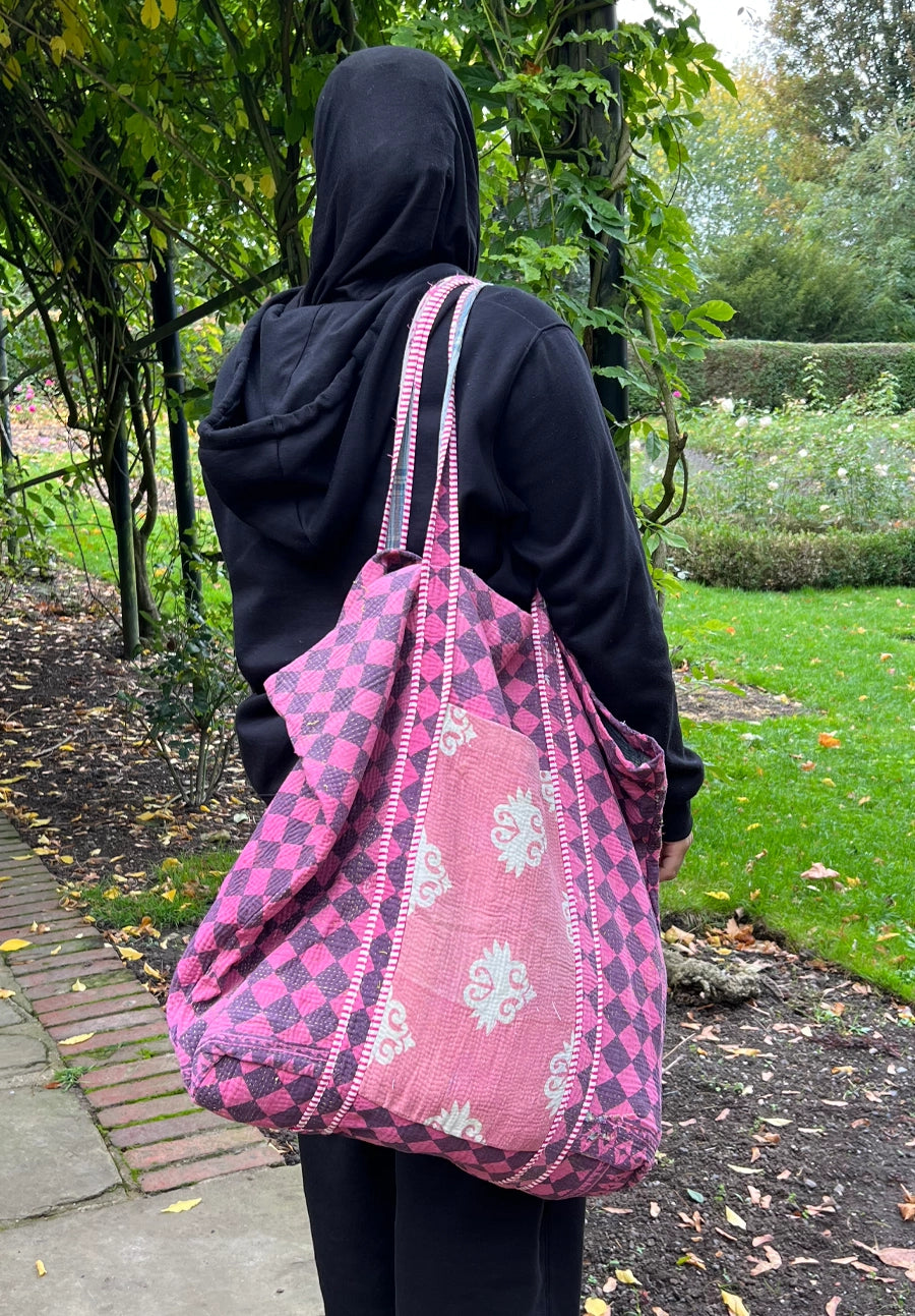 Crafted from vintage kantha quilts and off-cut block print fabrics from our eye masks, this large tote bag is a celebration of reinvention, resourcefulness, and everyday beauty. Each piece is unique, made using kantha quilts at the end of their life cycle, now thoughtfully refashioned into something new, purposeful, and full of charm.