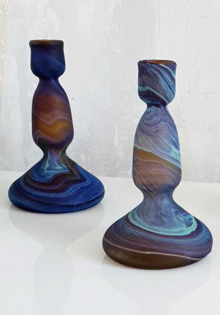 Meticulously handcrafted using the ancient art of glassblowing, these Phoenician candleholders are made in Palestine, showcasing the rich craftsmanship passed down through generations. Each piece is infused with vibrant metallic oxides, creating stunning colours and intricate patterns that are unique to the region.