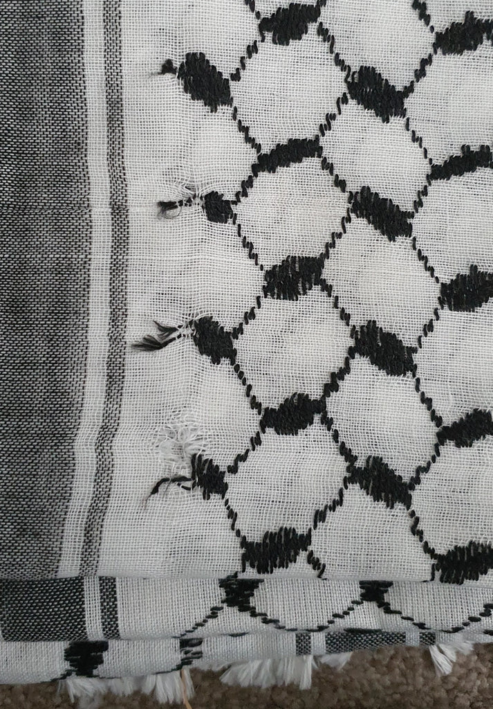 Imperfection: Some of these keffiyeh have small black/brown marks and some have dirt stains from the factory as seen. These may or may not come out in the wash. We would recommend spot cleaning. There is a mix of original 4 border Arafat keffiyeh and the new 2 border Arafat keffiyeh in this listing. Some keffiyeh will have dense short tassels whilst others will have thin twisted as pictured.