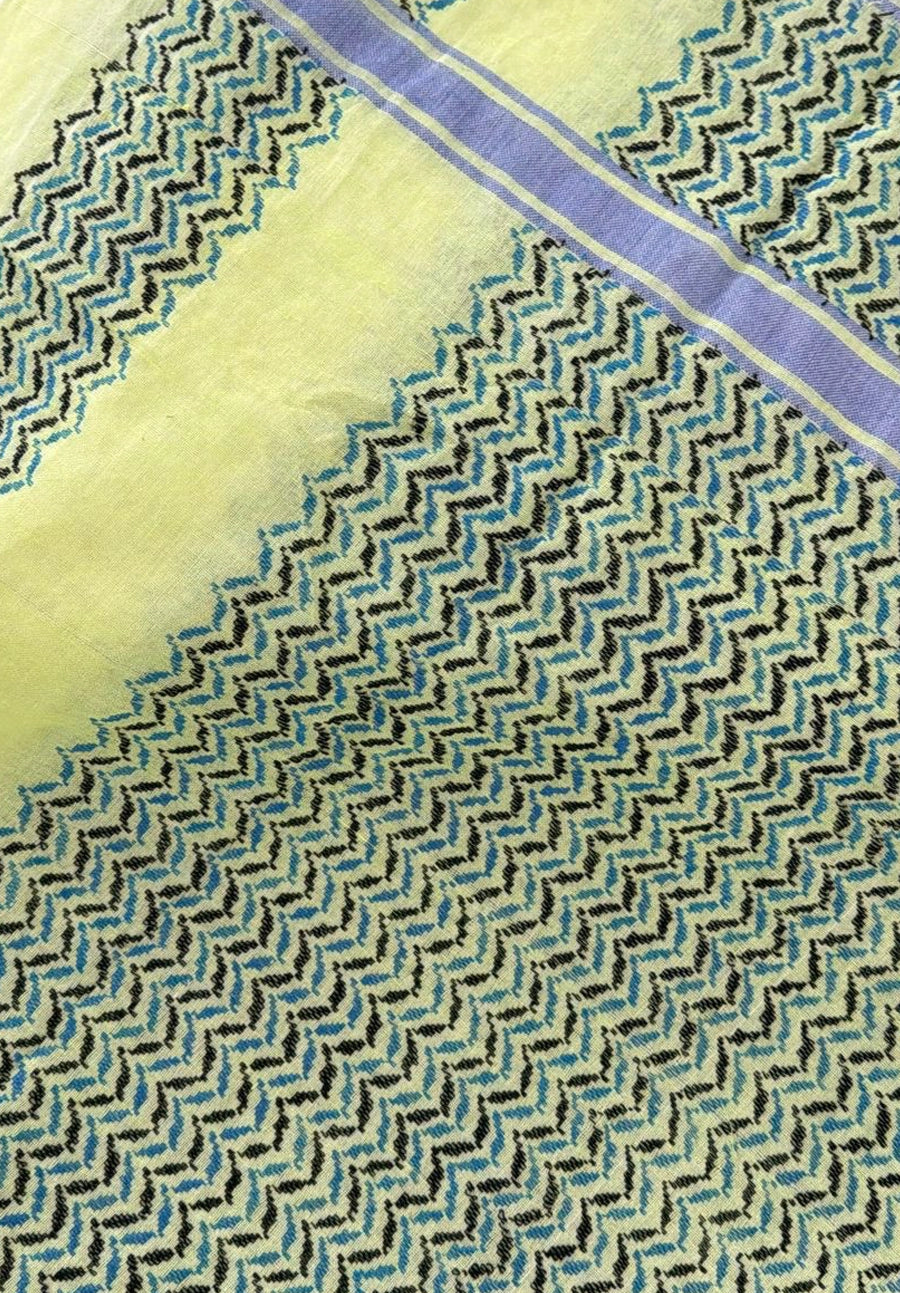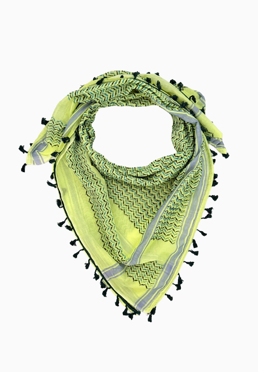 There are over 200 Palestinian keffiyeh made at the factory in Al-Khalil. We try our best to source patterns that are not so common. This stunning lime keffiyeh has a green pattern and green tassels.