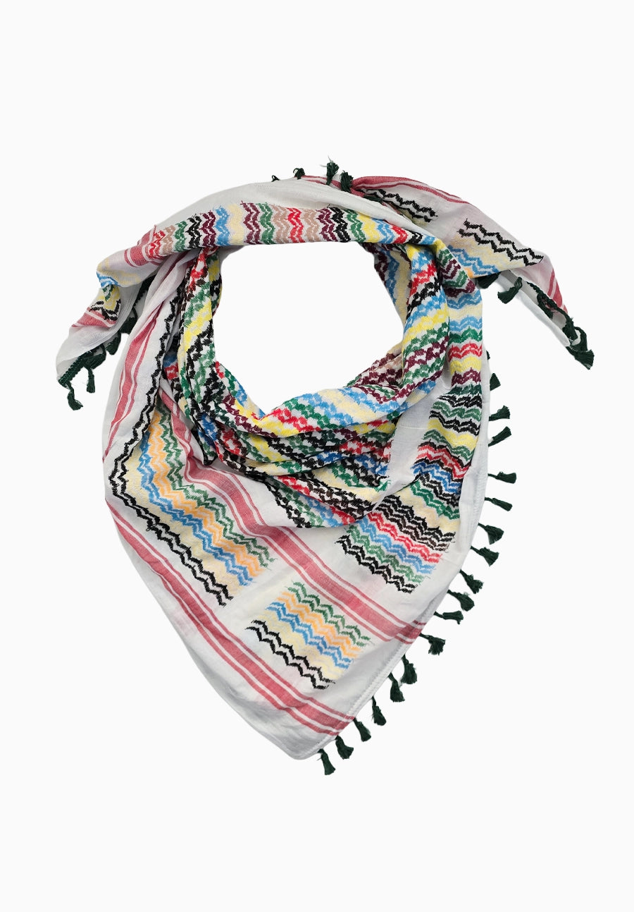 Wrap yourself in the Rainbow Keffiyeh Scarf and wear your support for a just world proudly. With each stitch, we weave together a vision of hope and resilience, uniting hearts and minds in the shared pursuit of a brighter future for all.
