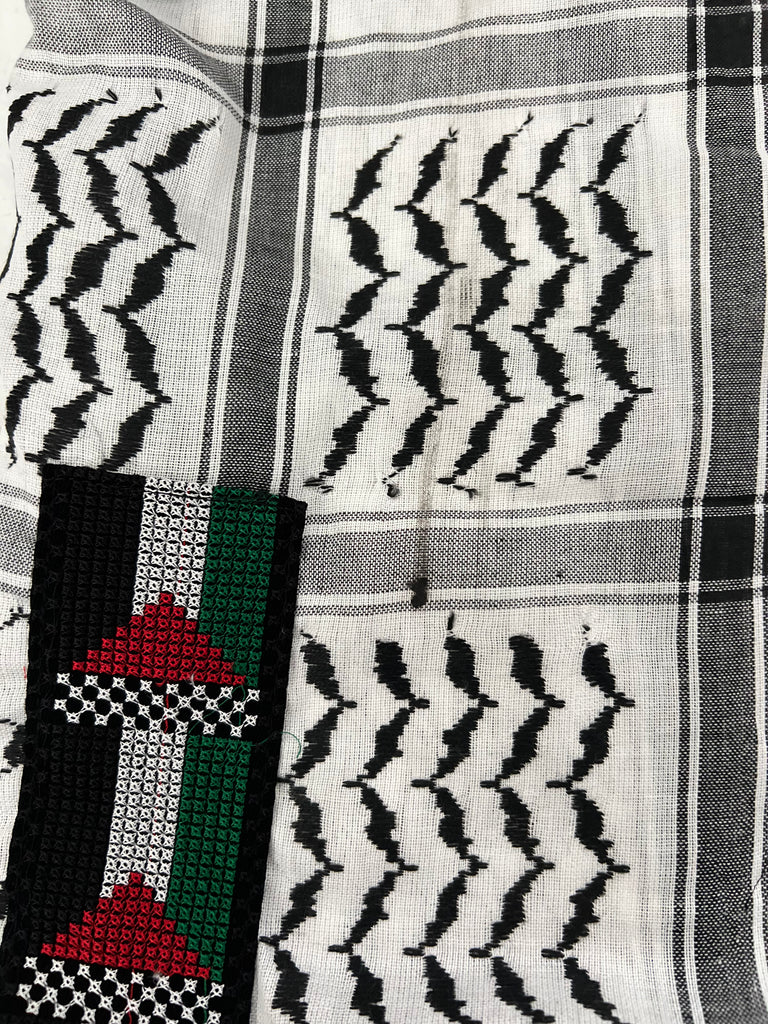 Colour: Black and white with Palestinian flag tatreez strip