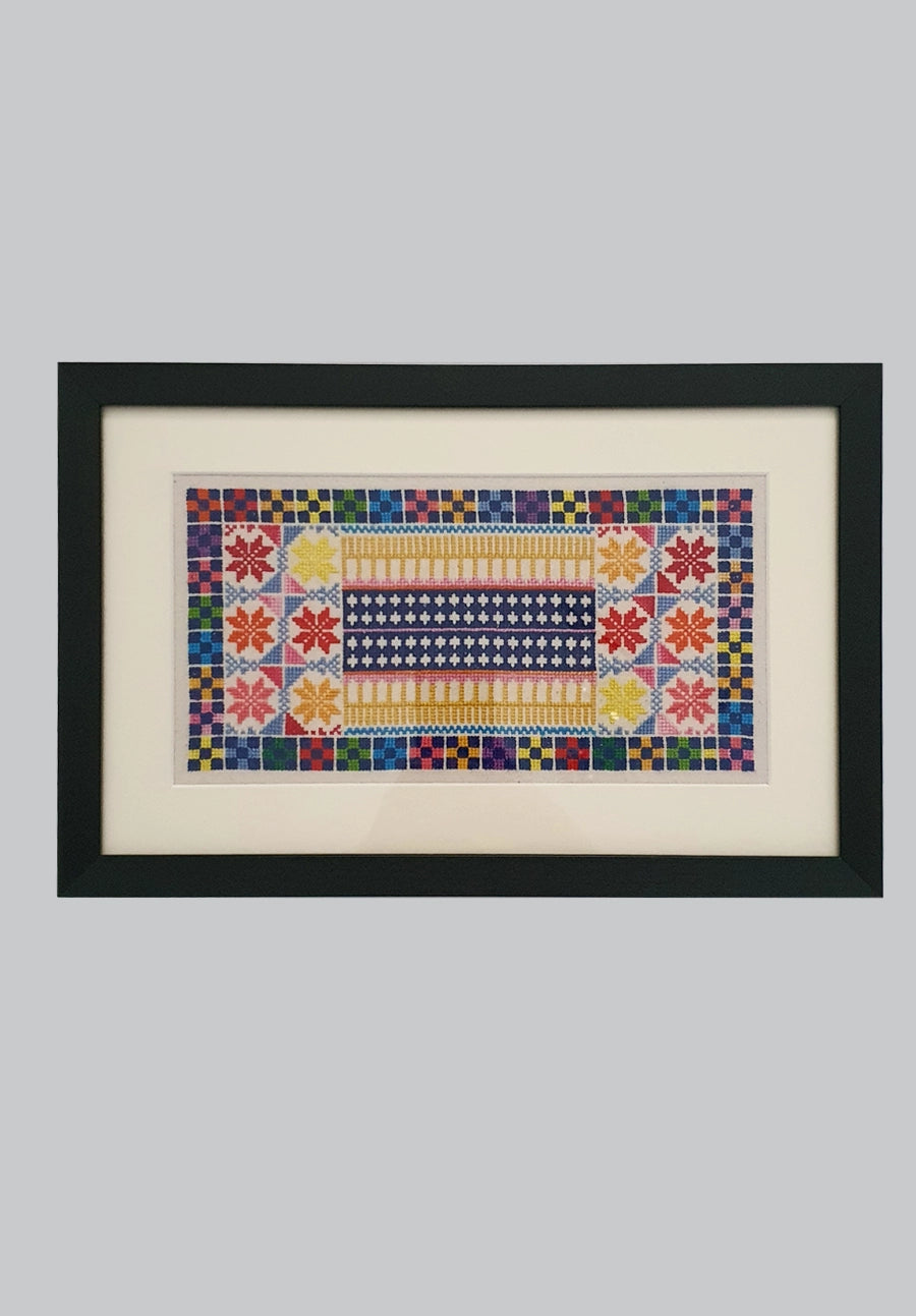 Framed Landscape Palestinian Tatreez Artwork, pattern by Sliman Mansour
