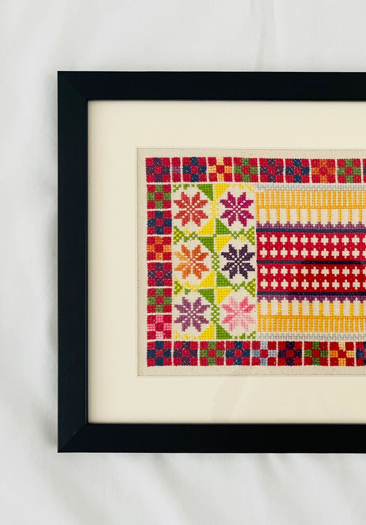 Framed Landscape Palestinian Tatreez Artwork, pattern by Sliman Mansour
