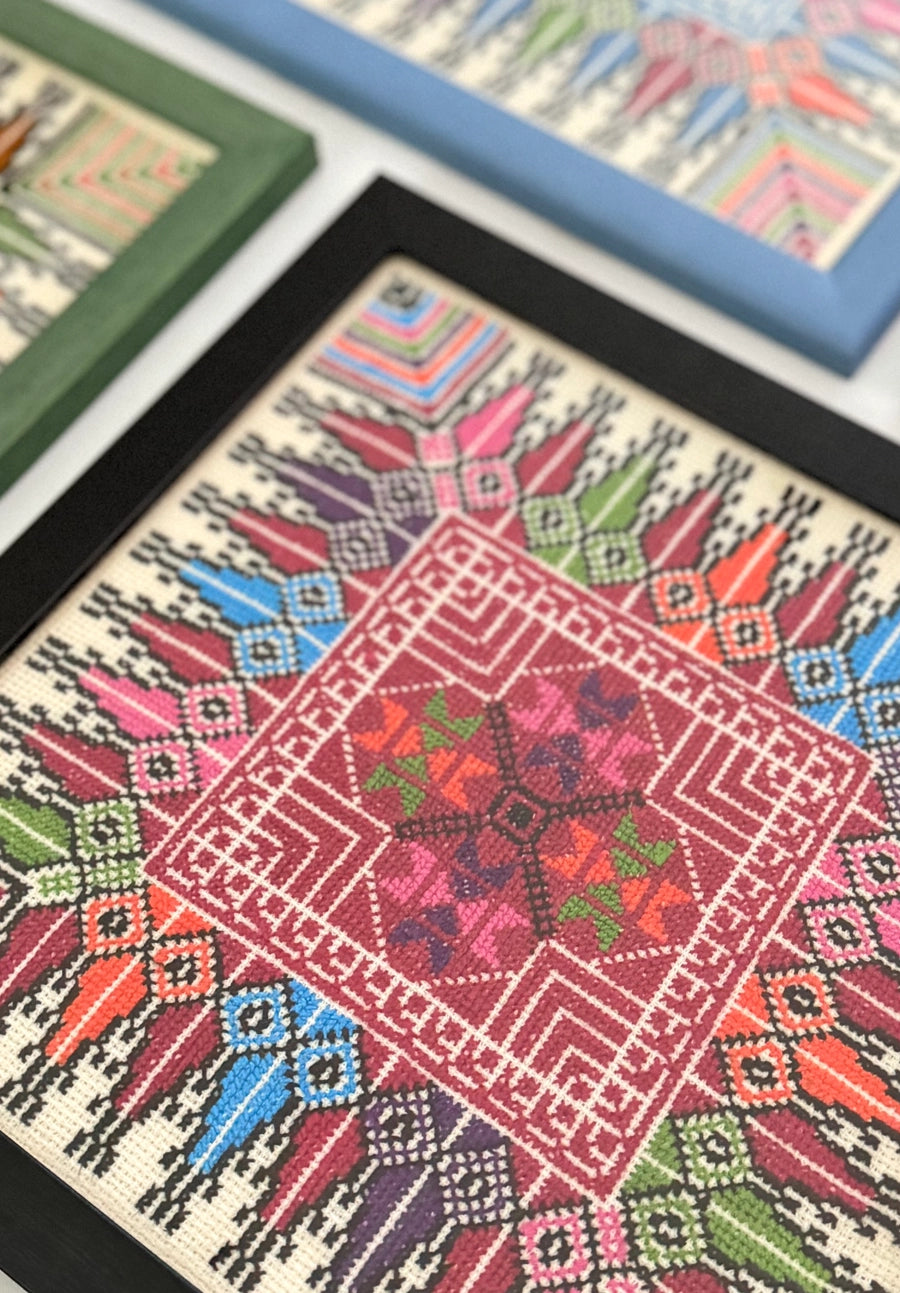 Red Framed Hand Embroidered Tatreez Art - Bethlehem, Palestine