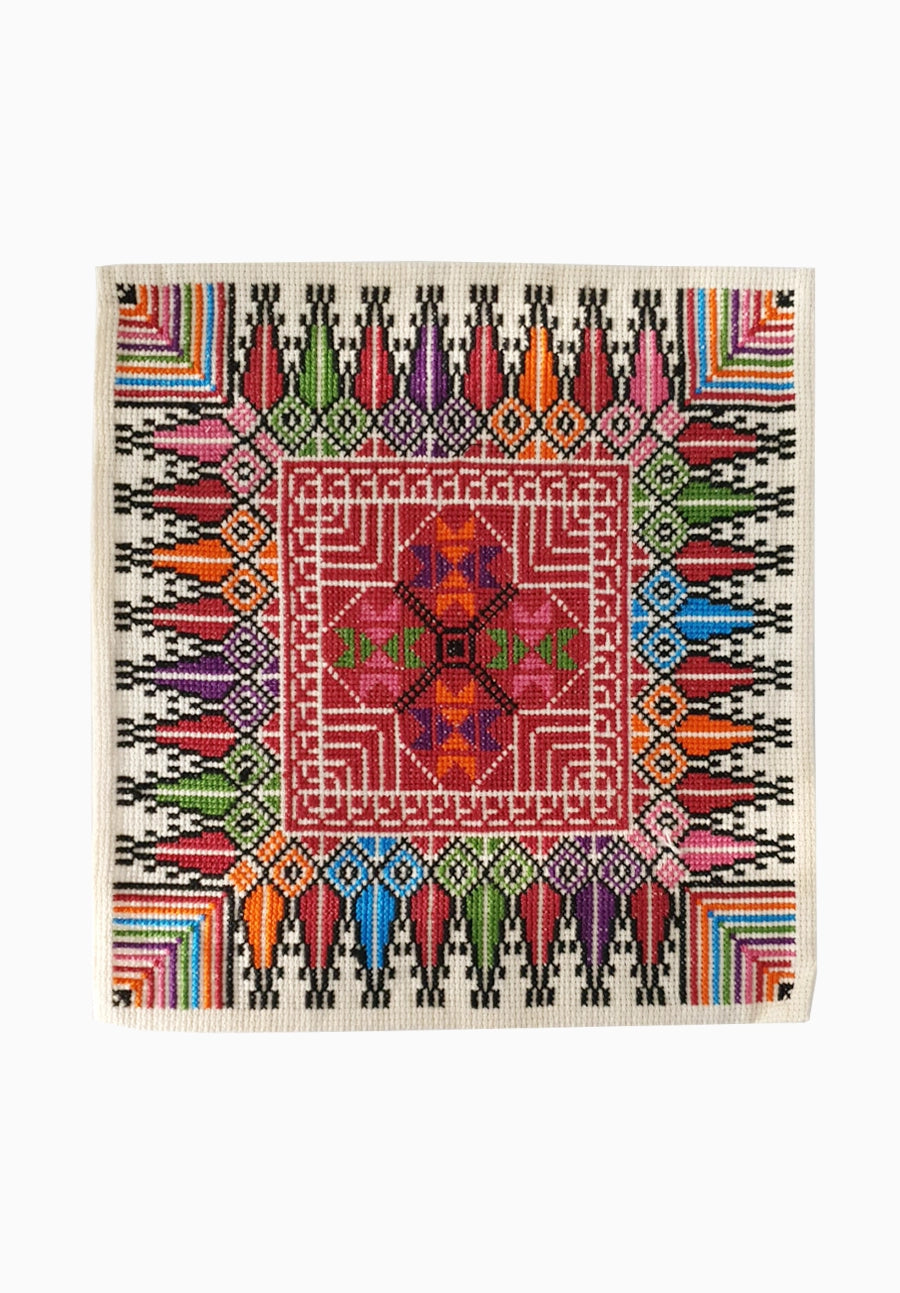 This multicolour tatreez embroidery has been hand-stitched by a women's cooperative in Bethlehem preserving the traditional art of Palestinian embroidery while supporting local livelihoods.
