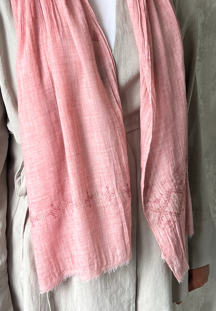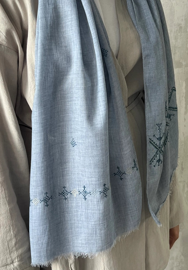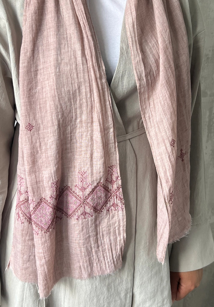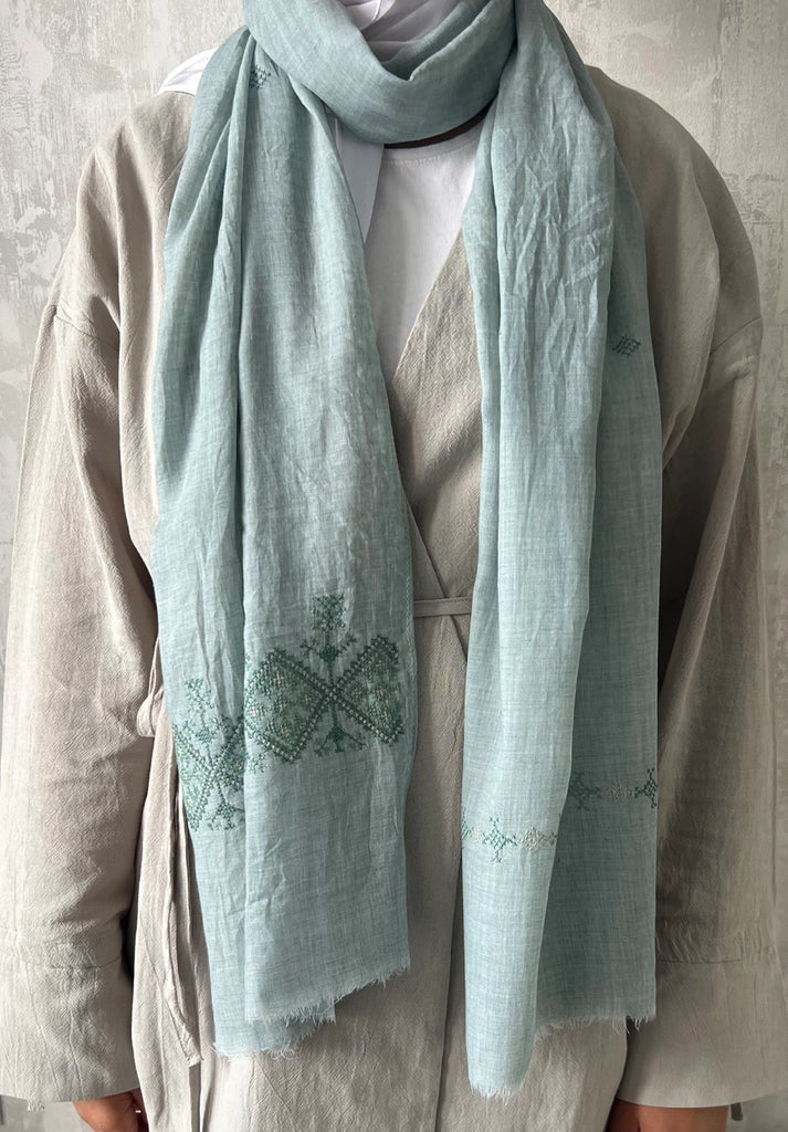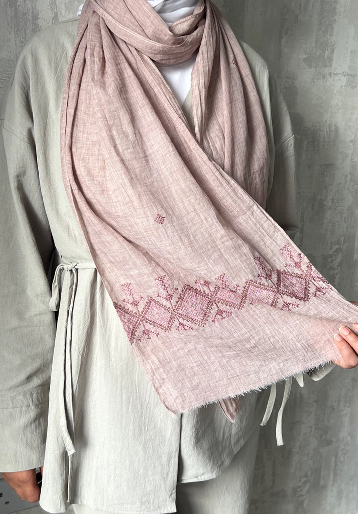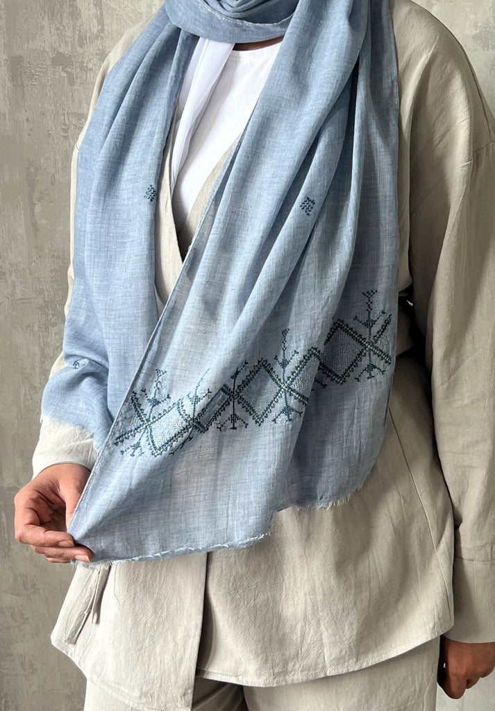 Elevate your everyday with these linen tatreez scarves, each one a graceful fusion of heritage and modern elegance. At one end, delicate hand embroidery tatreez border tells a story of resilience and artistry, stitched by the women of the Idna Ladies' Association in rural Hebron.