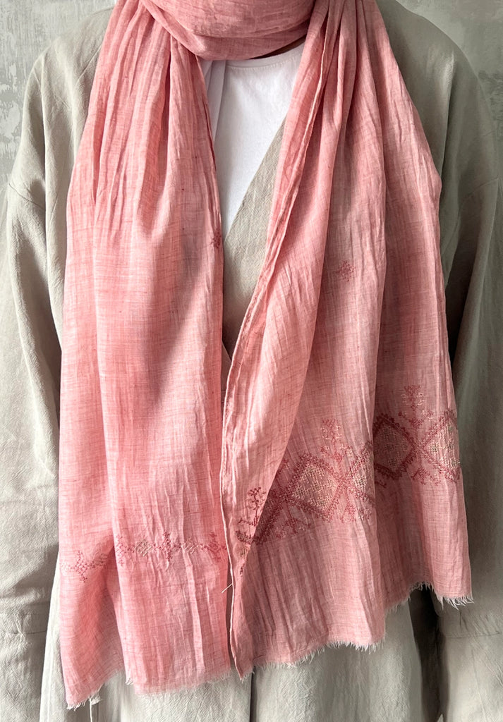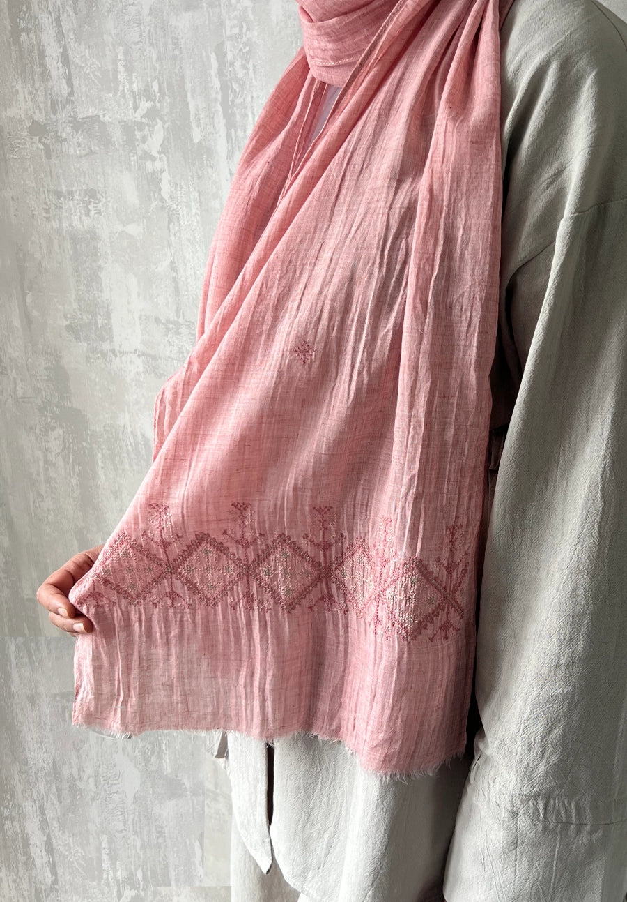 Pink Linen Gauze Tatreez Embroidered Scarf, Hebron - Palestine