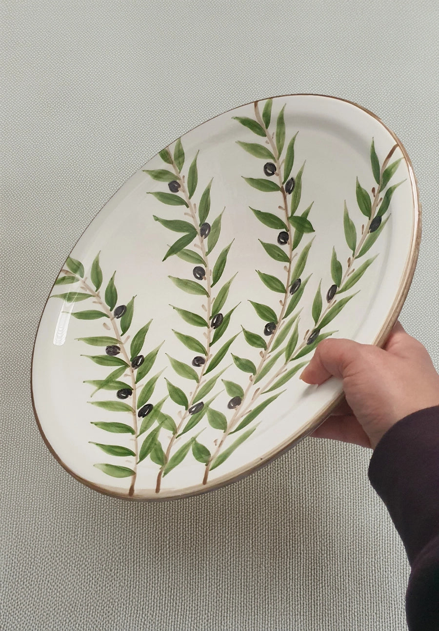 Elevate your dining experience with our Hand-painted Serving Dish, crafted with meticulous care by talented women artisans from Nisf Jubeil in the West Bank, Palestine. Each bowl is a masterpiece, adorned with intricate olive branch motifs that symbolise peace, prosperity, and the rich cultural heritage of Palestine.