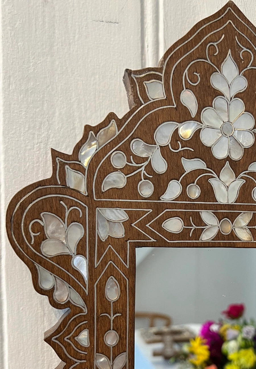 A meticulous craft from Damascus, where carved walnut wood is detailed with shell, pattern, and light.