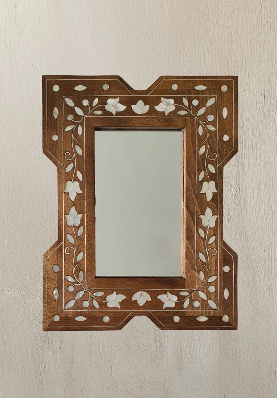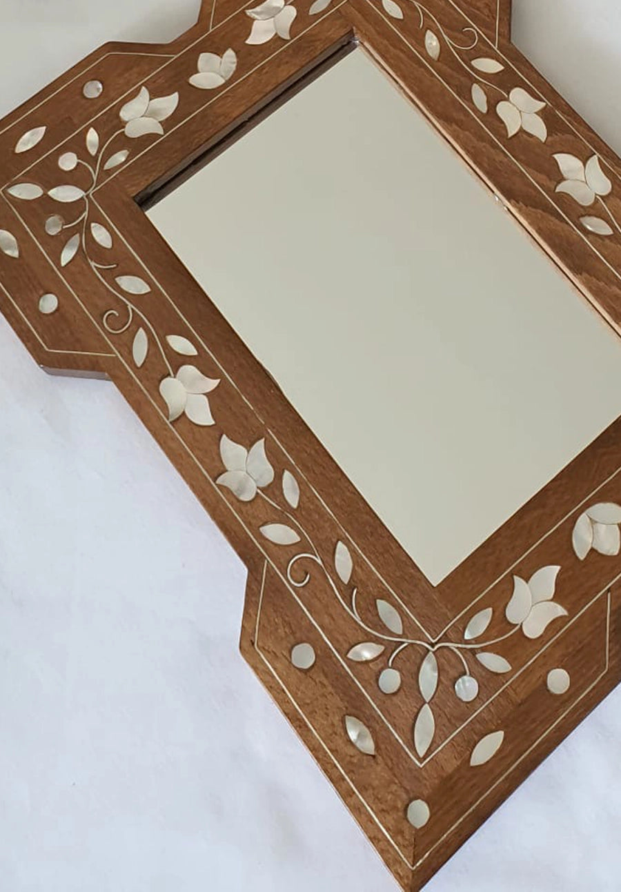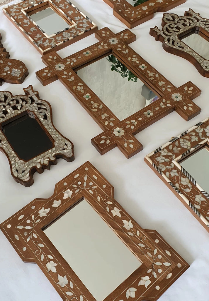 Our Walnut Wood Inlay Mirrors are exquisite pieces of craftsmanship, handmade by artisans in Damascus who continue a centuries-old tradition of wood inlay. Each mirror is crafted from natural walnut wood that has been carefully aged for years before being worked, ensuring both durability and beauty. The inlay work incorporates silver thread and sustainable sourced mother-of-pearl from the fresh waters of the Philippines, adding striking luminosity and refinement to every design.