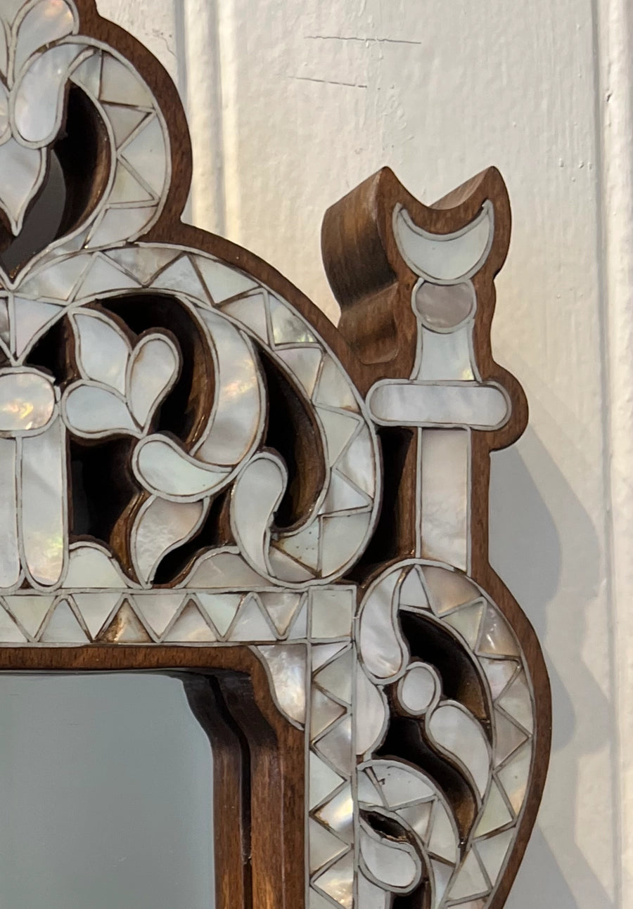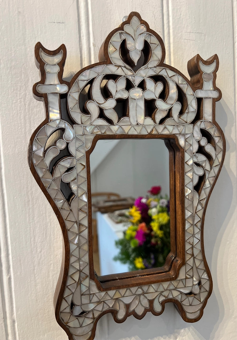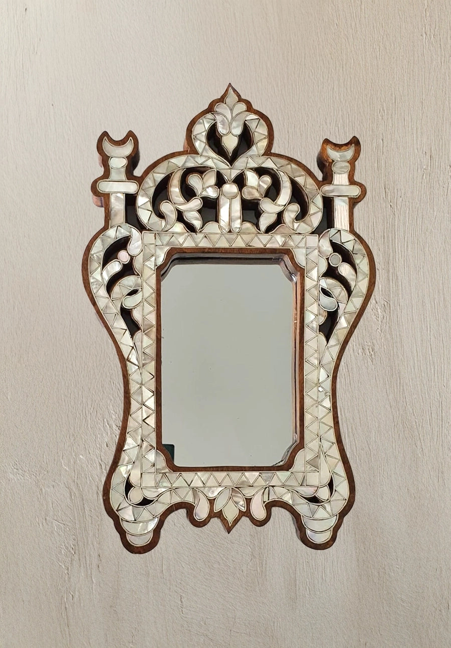 Our Walnut Wood Inlay Mirrors are exquisite pieces of craftsmanship, handmade by artisans in Damascus who continue a centuries-old tradition of wood inlay. Each mirror is crafted from natural walnut wood that has been carefully aged for years before being worked, ensuring both durability and beauty. The inlay work incorporates silver thread and sustainable sourced mother-of-pearl from the fresh waters of the Philippines, adding striking luminosity and refinement to every design.